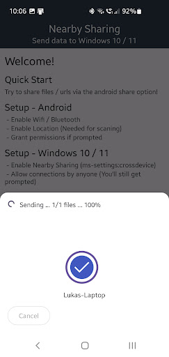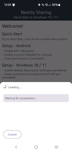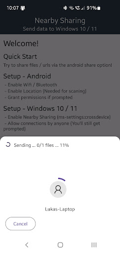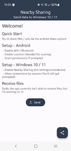 This app allows you to use the Windows 10 / 11 built in "Nearby Sharing" feature from your Android device.
