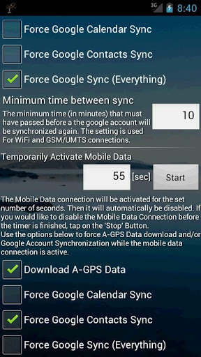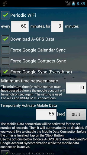 wifi Wizard automatically switches WiFi on and off.The app automatically switches WiFi on and off. User switches display on or off:You can define if WiFi is automatically switched on or off, when you switch the display onunlock or off. In addition you can define a wait time. WiFi Wizard will wait this time after you switch the display on or off until it switches WiFi on or off.You can temporarily activate the mobile data connection and it will be switched off automatically after a certain amount of time you can set. The mobild data connection is switched off even if you close WiFi Wizard. For WiFi and mobile data connection you can force a google account sync and AGPS Data dowload. This allows for short online time, sync everything, and go offline. All actions will be logged in the apps log. You can view and export the log.The app has a builtin manual for quick reference.