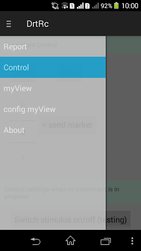 * Control: On this screen, commands can be send to the Arduino DRT device. E.g., start/stop. Or switch stimulus on, when no experiment is running to test the setup. Experimental conditions can be also labeled with markers. E.g., send marker '1' to tag that the subjects is now in situation '1'.