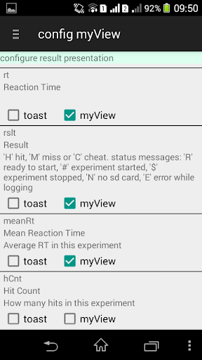 * config myView: Let you configure how and what you want to see of the status messages from the Arduino. The data items can be shown on your individualy configured myView and/or in screen pop-ups (toasts).