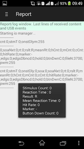 * Report: It is a kind of log. You see the last 100 raw lines (automatic scroll) of events on the USB connection and on the serial line from the Arduino.