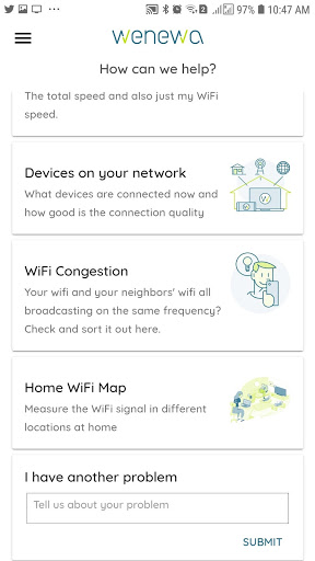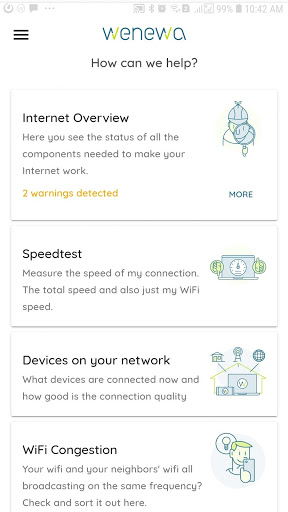 Here are some of the performance and configuration tests wenewa runs: WiFi Congestion, Network Name Conflict, Router Configuration, Port Scan, DNS Servers, WiFi and Mobile Internet Congestion, Internet Route, Fixed Line Status, Local Network Devices, Mobile Internet Connection Status.
