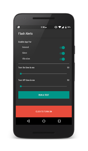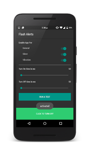 This is a simple android application which uses your phone's flash to notify when someone calls you. This app also allows user to set the flash intensity by changing the flash on and off values. It provides user an option to run in different device modes like General, Vibration, Silent.