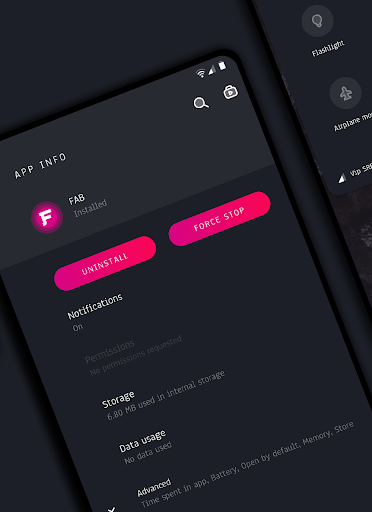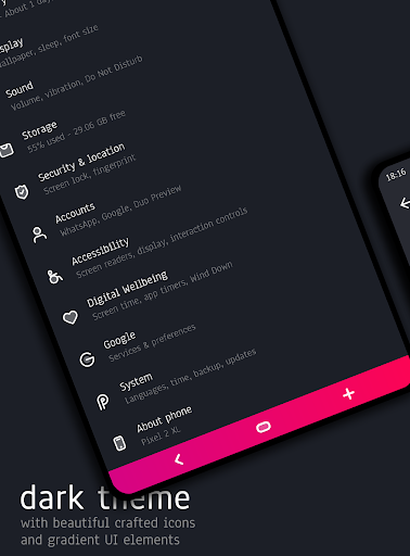 This is dark theme with beautifully crafted icons in all the apps and gradient UI elements, such as switches, progress bars, buttons, navigation bar, floating action buttons and more.
