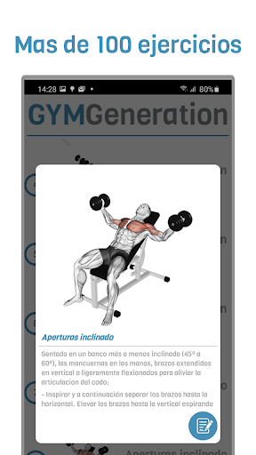 Higit sa 100 iba't ibang mga pagsasanay upang maisagawa Ang gym na may paliwanag ng ehersisyo pati na rin ang mga kalamnan na kasangkot, mga imahe, mga video, at anotasyon ng iyong pag-unlad.