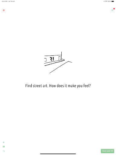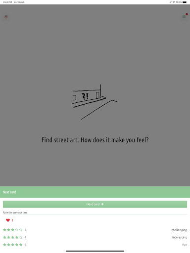 The active engagement of communities in their urban spaces unleashes in them new understanding of their urban surroundings, to open up channels of dialogue between individuals and groups through a device that makes the unpacking of urban space part of a game. The task cards that are dealt are created with the intention of heightening the experience of the city for the user, by calling them out to search for specific architectural, urban or social points of interest, thus allowing users of the application to see their urban spaces in a different light.