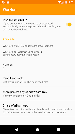 • COLLABORATE WITH THE DEVELOPER: WarHorn offers the possibility to the user to click on the buttons that are called DONATE, in this way the developer does not invade the application with advertising (ads) constantly. Send feedback to the developer through the social networks mentioned at the bottom of this text.