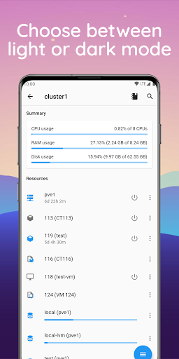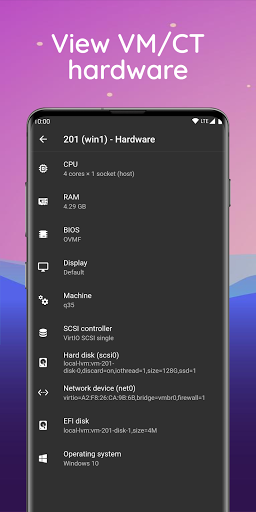 • View Proxmox nodes, storage pools, VMs, and containers' statuses.