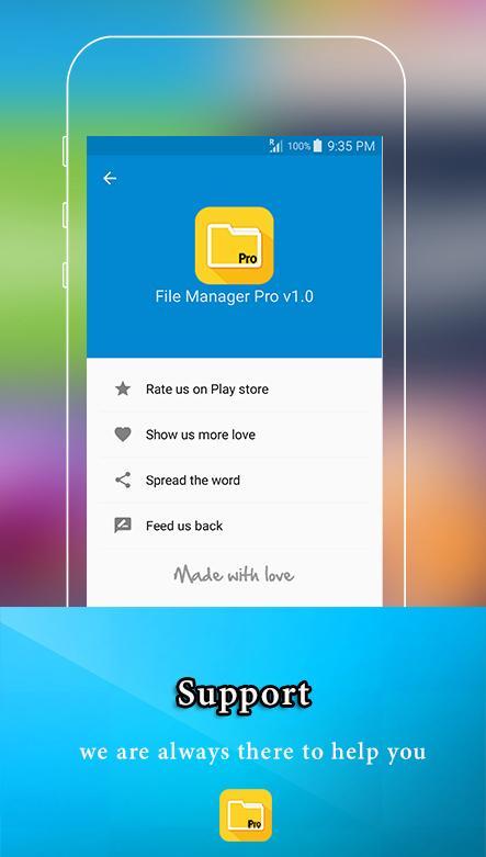 File Manager Pro (File Explorer) is a full-featured file (Images, Music, Movies, Documents, app) manager for both local and networked use! File Manager Pro(File Explorer) helps manage your android phone and files efficiently and effectively and share files directly through ftp protocol. Now access files directly from PC/Laptop with high-speed access through ftp connection.
