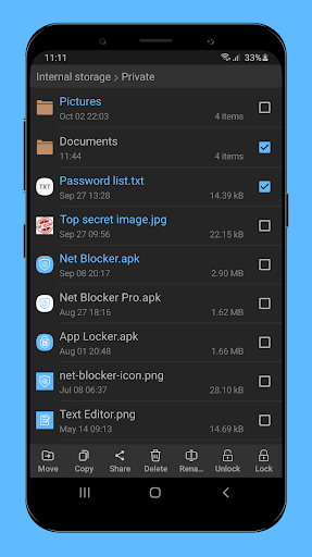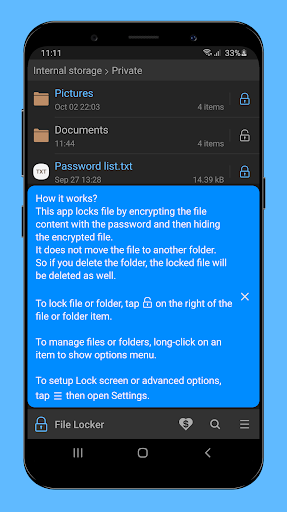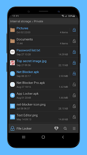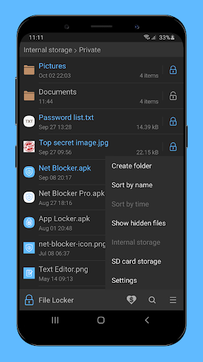 File Locker allows you to prevent unwanted access to your private files with PIN, pattern or password lock.