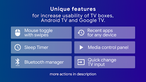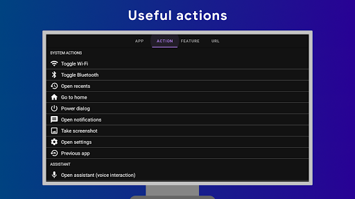 tvQuickActions allow you assign up to 5 actions to button of your remote and add a lot of useful functions to your device. Supports Android TV, Google TV and AOSP on most of devices.