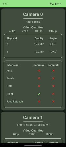 A simple app to list supported Camera2/CameraX extensions and other camera capabilities.