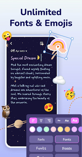 We provide unlimited entry editing options, pictures, emojis, moods, etc. Also, you can decorate your entries with stylish fonts and backgrounds.
