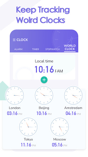 The Clock has a World Clock and World Clock Widget which displays exact time in cities and countries across the world. Whether you are a traveler, a business person or someone who has relatives abroad, The Clock offers a beautifully designed World Clock where you can customize and add as many cities as required.