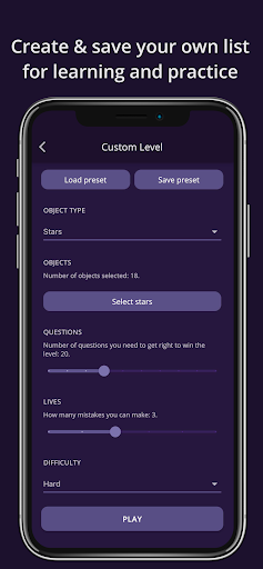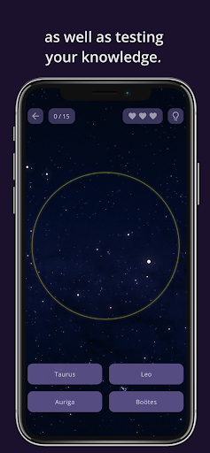- Three training and testing modes for each level (easy, medium and hard) to help you progress smoothly and guide you to eventually recognize the constellations and stars in the real night sky.
