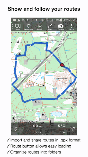 Why should you buy an expensive GPS device if you can install Topo GPS? Topo GPS contains all functions of a regular GPS device for less money, has a much more detailed map, and is more convenient to operate. The accuracy of the position determination is in favorable conditions about 5 m.