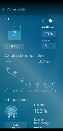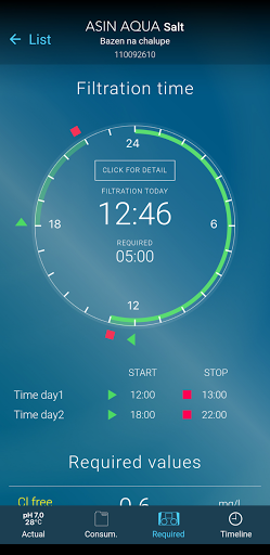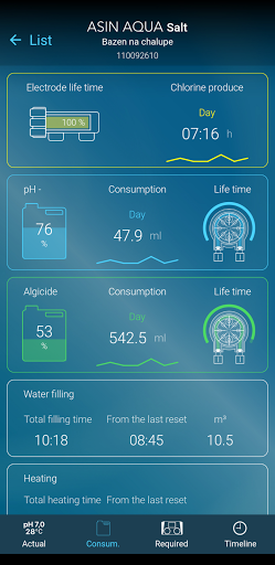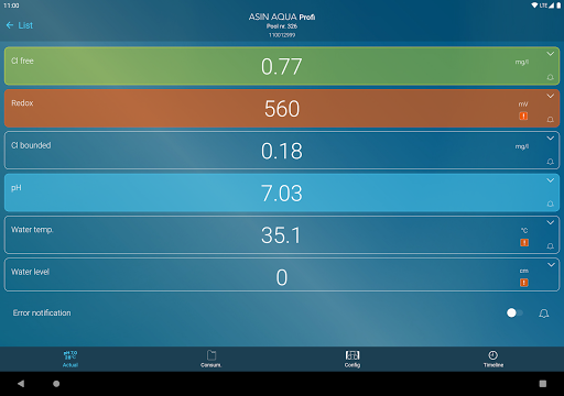 The POOL LIVE app shows data of the pool measured by the ASIN AQUA (device with internet connection). Application allows to set notifications if limits of the measured parameters are exceeded. Shows actual parameters and history timeline.
