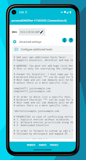 personalDNSfilter is a DNS filter app for Android. It hooks into the domain name (DNS) resolution and blocks access to filtered hosts. It can be used for filtering any unwanted hosts which are related to malware, phishing, tracking and more based on a host list.