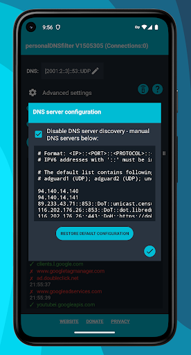 CAUTION: With version 1.50.48.0 config files are now stored in storage/Android/data/dnsfilter.android/files/PersonalDNSFilter/ - use a file explorer to backup files.