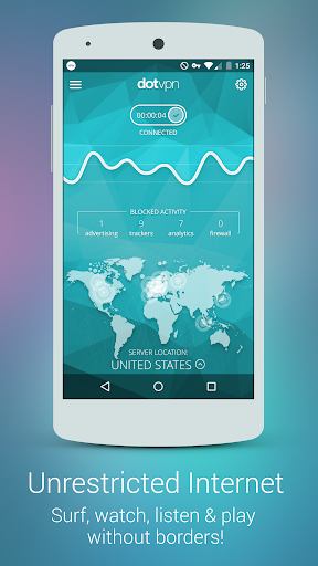 Our VPN for Android gives you unlimited bandwidth, access to more than 10 virtual locations. Use one account for VPN and Proxy protection on all your devices. Some content is not availiable from our free VPN location in USA, so you can change your VPN connection to United Kingdom for watching websites like BBC. Note, you have unlimited switches between VPN locations. If you still can’t connect, please contact vpn.android@dotvpn.com with device name and OS version.