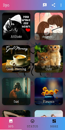 Dp And Status have the good and the best collection of Dp's , Profile Pictures(Pics), Display Pictures and Status's . This is the best Dp And Status for WhatsApp for dp's and status. This App has very simple interface with Latest, Trending dp' and status categories . DP (Display Picture) and Status across different category. Dp and Status provides unique and stylish , trending categories with different Dps and Status.