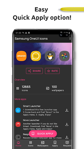 Apply these One UI icons, set a cool Samsung stock Wallpaper from the icon pack's amazing collection of OVER 100 SAMSUNG STOCK WALLPAPERS or get one from the recommended app in the icon pack's home screen and live your Samsung dream with this super easy to install icon pack.