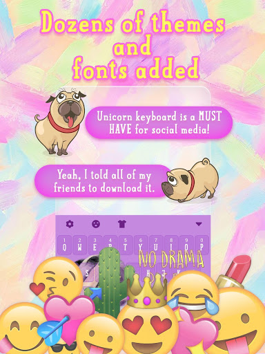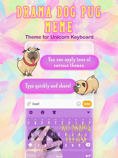 Hi Unicorn keyboard fans, new stylish & trendy themes are released regularly to let your keyboard always stand out! We know how much you like meme Keyboard Theme to beautify your mobile gadget and that is why we created Drama Dog Pug Meme Keyboard Theme! Now you can adorn your keyboard cover with some cute pug while sending love messages, or chatting with your best friends.
