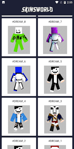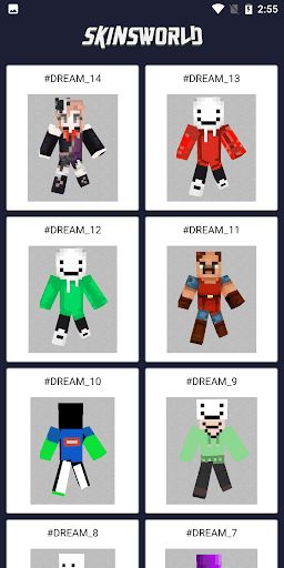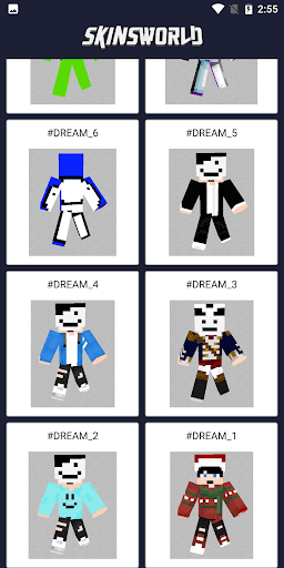 Dream Skin For Minecraft contains collection of skin for MCPE. You can find lots of skins from Dream and a very simple way to install skins in mcpe and download theme to gallery!