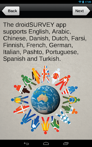 The Droid Survey App supports Spanish, Danish, German, French, Portuguese, Arabic and English.