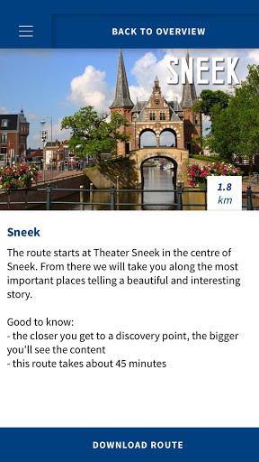 Download the route of your choice, preferably on a WiFi connection so you do not have to depend on an internet connection outside in nature. After the route has been downloaded, it is available offline in the app under "my routes". The "MeAR Fryslân" app takes you, with the GPS of your mobile phone and a clear map, along the points where you get to see something beautiful. Per point, first a brief explanation is given after which you can start the experience.