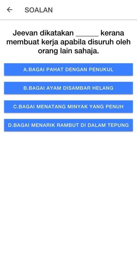 Peribahasa merupakan ayat atau sekumpulan kata yang tersusun dan mengandungi makna atau pengertian yang tertentu.Susunan katanya pendek tetapi menepati makna yang ingin disampaikan.Seseorang individu yang mahir menggunakan peribahasa dianggap telah menguasai kemahiran berbahasa dan mempunyai pengertian yang tinggi dalam bahasa Melayu. Aplikasi ini mengandungi peribahasa Melayu berdasarkan temanya.Aplikasi ini mengandungi sebanyak 12 tema bersama maksud dalam bahasa Melayu, bahasa Inggeris dan bahasa Tamil.Ini memudahkan para pelajar memahami setiap peribahasa secara lebih mendalam dan terperinci.Mereka dapat menjimatkan masa kerana peribahasa telah diagihkan berdasarkan 12 tema.Aplikasi ini juga akan memudahkan proses Pengajaran dan Pembelajaran (P&P) pelajar dan guru untuk mencari maksud peribahasa.Keunikan aplikasi ini adalah pembahagian maksud peribahasa dalam bahasa Melayu, bahasa Inggeris dan bahasa Tamil.Penggunaan aplikasi ini bukan sahaja untuk pelajar sekolah rendah malah boleh digunakan oleh pelajar sekolah menengah.
