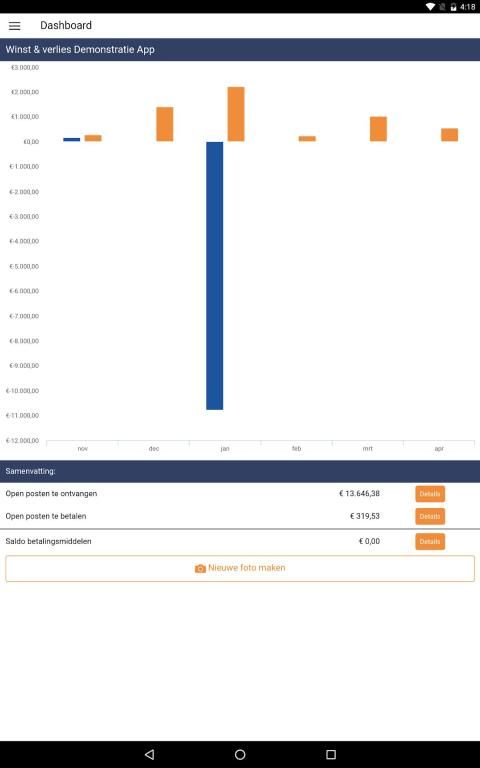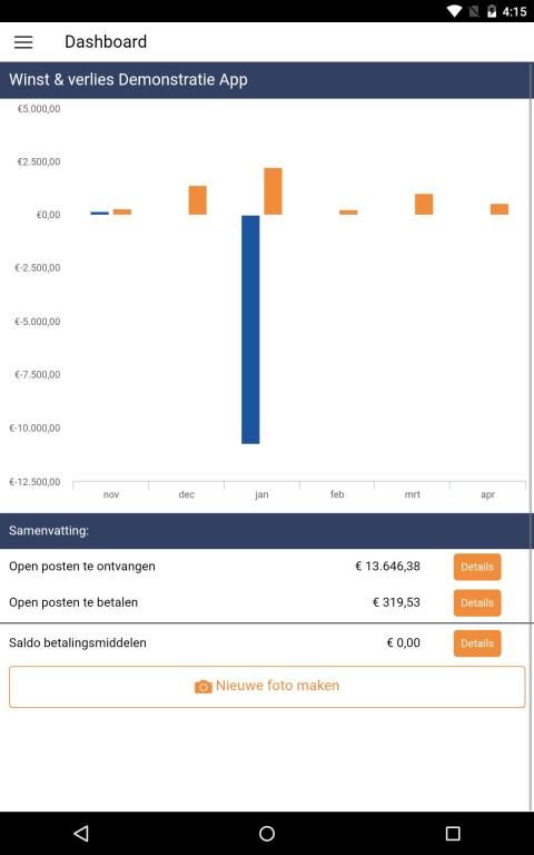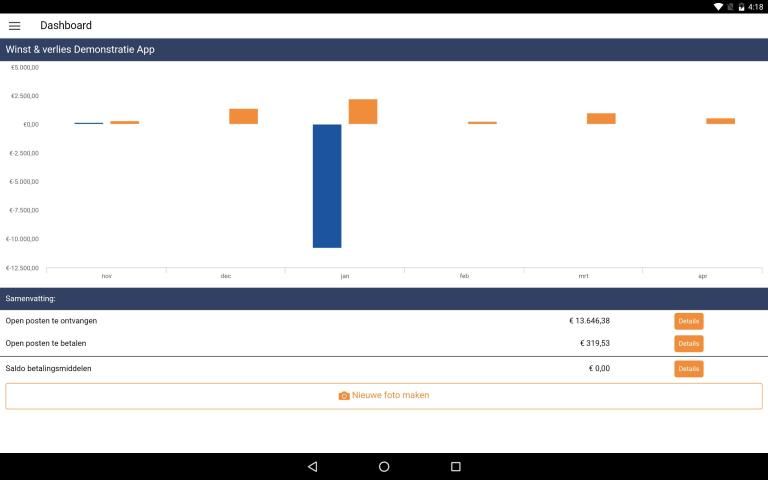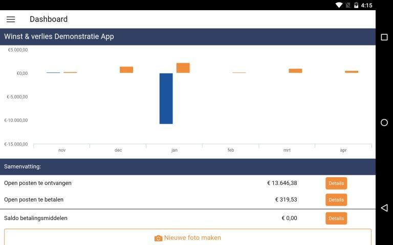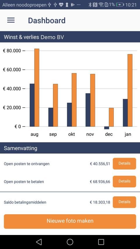 De e-Boekhouden.nl-app is een verlengstuk van het online boekhoudpakket www.e-Boekhouden.nl. De app biedt u op uw smartphone of tablet inzicht in uw financiële cijfers, open posten etc. Daarnaast kunt u via de app foto’s maken van facturen en bonnetjes en vervolgens direct sturen naar uw digitale archief binnen e-Boekhouden.nl.