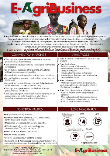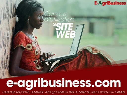e-agribusiness est une plateforme de mise en relation des acteurs du secteur agricole. Elle permet d’une part aux Agriculteurs (y compris les plus vulnérables) vivant dans les zones les plus reculées et ne disposant ni d'internet, ni de smartphones de trouver de nouveaux débouchés pour leurs productions sur les marchés locaux, régionaux et internationaux, et d’autre part met à la disposition des acheteurs des informations pertinentes pour faciliter leurs achats. Le même système permet de recevoir des conseils avec des experts sur les nouvelles méthodes culturales et la météo par SMS pour éviter les risques liés aux aléas climatiques lors de l'étape de production.