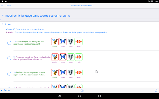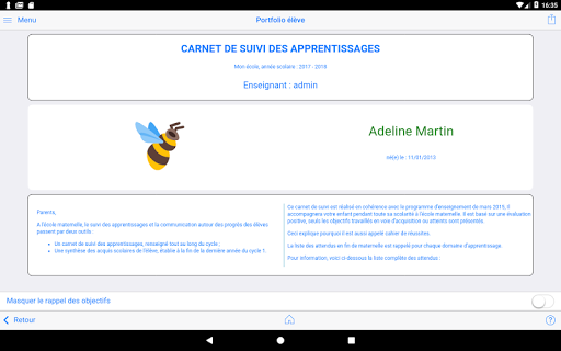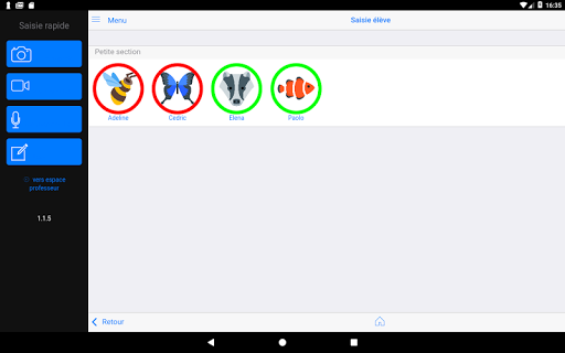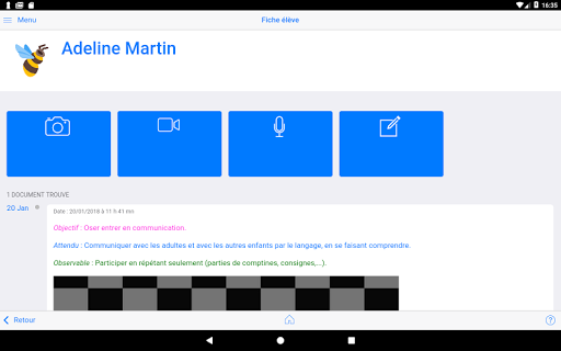 для учителей, приложение позволяет мгновенно вводить и хранить все типы документов (изображение, аудио, видео, текст) для каждого Студент класса. Инструмент интуитивно понятен и адаптирован к маленьким детям, которые являются актерами их обучения.
