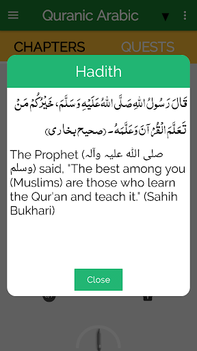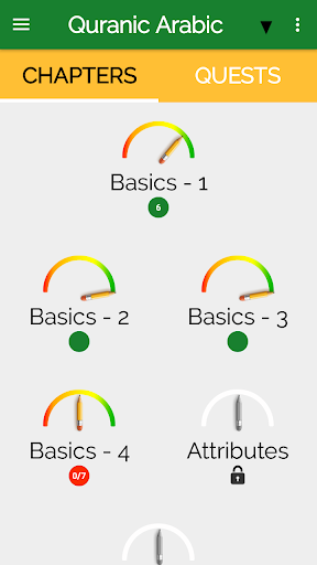 The first four chapters contain 25 lessons and more than 150 words, this makes about 46.5% vocabulary of the Holy Quran. These chapters are completely free and all the other chapters can be unlocked by spending Gold Coins that you earn while studying these lessons. If you are short on Gold Coins, you can buy them at a very low cost.