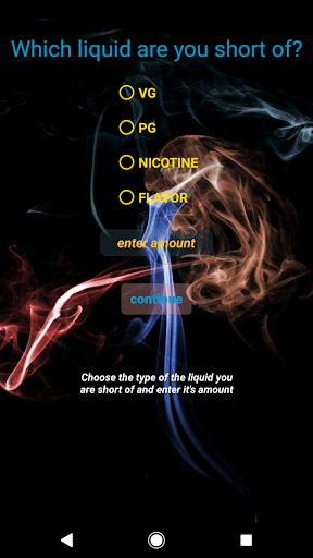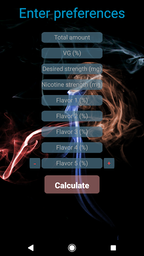 This app lets you easily calculate e-liquid amount if you don't have enough vegetable glycerin, propylene glycol, nicotine or flavour. It also provides the simple calculator.