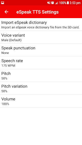 This port of eSpeak TTS is built on the eyes-free version. It fixes multiple issues found in the eyes-free version: Fixes crashes on Android 4.3 and later versions, Lot of customization options implemented like eSpeak desktop application, and Various memory leaks and crashes are fixed.