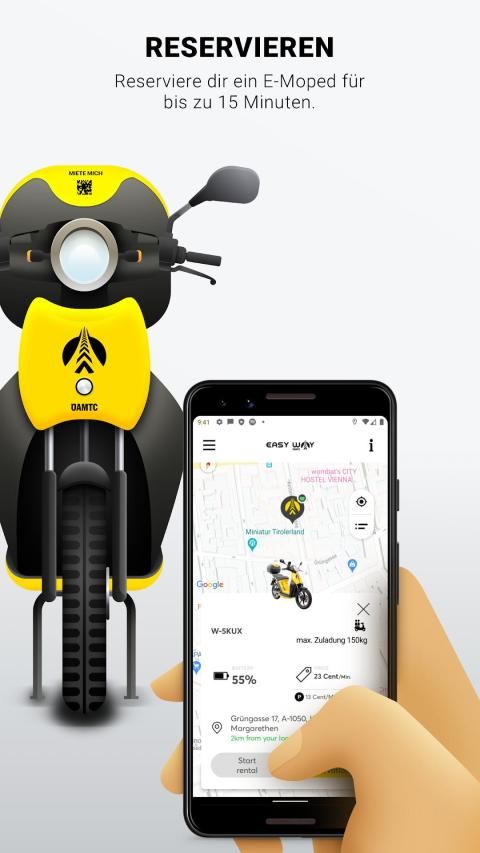 ÖAMTC easy way ist das E-Moped-Sharing des Mobilitätsclubs in Wien und Graz. Nach erfolgreicher Registrierung kannst du mit deinem Smartphone zu jeder Zeit ein ÖAMTC easy way E-Moped mieten und deine Stadt erkunden.