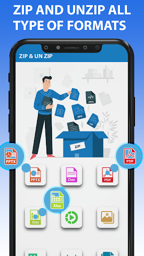 Zip Unzip File Manager – Zip File Reader has a simple yet user friendly interface where you will find a screen with all the files we usually want to zip like images, audio files, videos, doc file, ppt, xls, pdf files so that you don’t have to go through the directory in order to find a file so that you can zip or unzip it. Moreover there are separate zip and unzip buttons in which you can find all the zipped and unzipped folders in a single list without going through a lot of files. Use this Zip Unzip File Manager – Zip File Reader to zip image files and save space or send images to friends and family or can zip video files which will lead to saving some storage and can be sent easily via multiple platforms. You can also use this zip unzip app to compress document files like doc, docx, ppt, pptx, xls, xlsx files etc. hence saving you a lot of space for other use.Zip Unzip File Manager – Zip File Reader supports multiple file zipping formats like 7z, tar, rar, tgz etc.