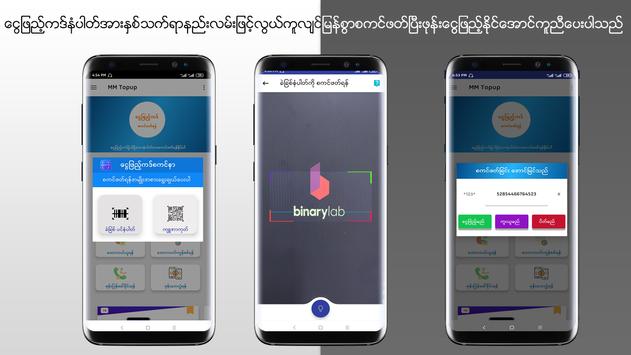 ဤ အပလီေကး႐ွင္းမွာေတာ့ ဖုန္းေငြျဖည့္ကဒ္မွာ ပါ႐ွိတဲ့ ပင္နံပါတ္ကို ႐ိုက္ထည့္စရာမလိုဘဲ အလြယ္တကူ စကင္ဖတ္ၿပီး ဖုန္းေငြျဖည့္သြင္းႏိုင္ပါတယ္။ ပင္နံပါတ္အျပင္ ေငြျဖည့္ကဒ္နဲ႔ပါ႐ွိေသာ က်ဴအာ ကုတ္အား စကင္ဖတ္ၿပီးလဲ ေငြျဖည့္ႏိုင္ပါေသးတယ္။