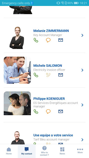 • “My Contact”: Reach your ES dedicated interlocutors by phone, sms or email. In case of a doubt, the “Who to contact?” function allows you to find the right person according to your needs.