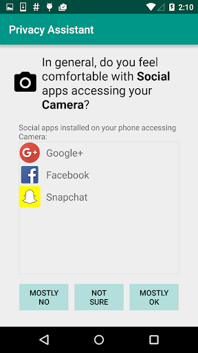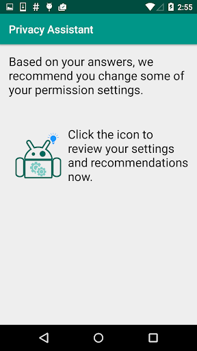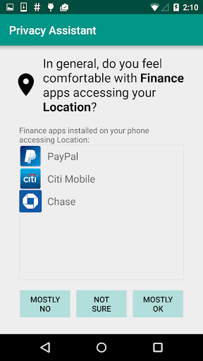 Privacy Assistant is an app developed at Carnegie Mellon University by the Privacy Assistant project (http://privacyassistant.org/). The app uses machine learning to help users control the information that can be collected and used by mobile apps they install on their Android smartphones. It does so by asking users a small number of simple questions before recommending some possible changes to their permission settings.