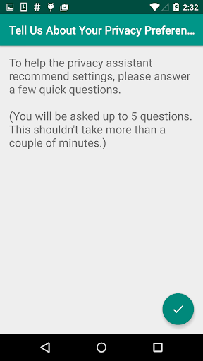 ○ XPrivacy (https://github.com/M66B/XPrivacy) emphasizes very fine permission settings and gives everyone the same recommendations. Our research shows that most users are only willing to devote so much time configuring their privacy settings and that not all users have the same privacy preferences. Our Privacy Assistant app uses machine learning to quickly help you identify which settings are right for YOU and to help you modify your settings accordingly.