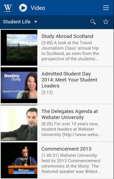 A free Android app designed to connect Webster University information to your mobile device. The app grants access to the Webster directory, campus maps, virtual campus tour, news, events, dining, student courses, online classes, athletics, photo and video feeds. Continuous development and improvements for worldwide locations is ongoing. Tablet Users should use the tablet optimized website: m.webster.edu