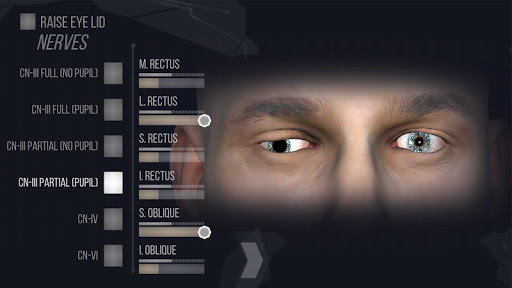 Simply touch the screen and the eyes will follow your finger. Use the sliders on the side of the screen to weaken individual muscles and simulate different conditions. By swiping left or right, you can find toggles to disable different cranial nerves. To access the pupil mode, use the flashlight button on the bottom.