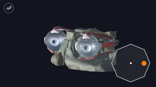 To view the 3D eye model, use the leftmost button on the bottom bar. You can rotate and zoom in this mode, and you can control where the eyes look using the joystick controller to the right. You can also interact with individual muscles to further see how each works.
