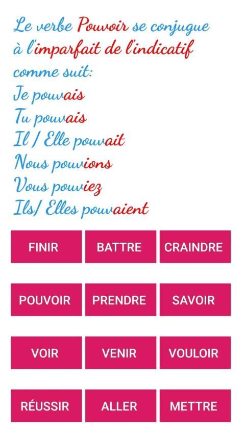 - E-Mtyaz includes a conjugation table equipped with speech synthesis, which aims to train you to memorize the conjugation of the usual verbs at various times.