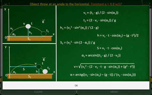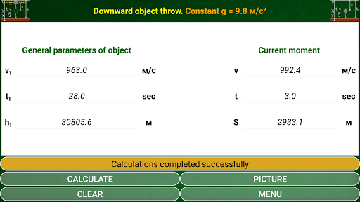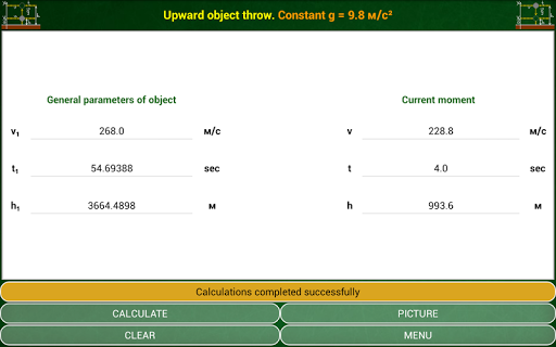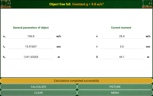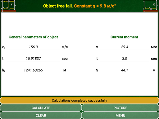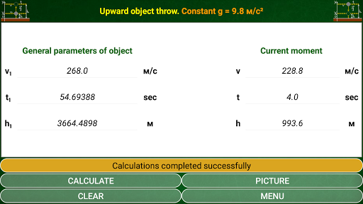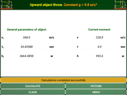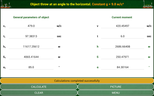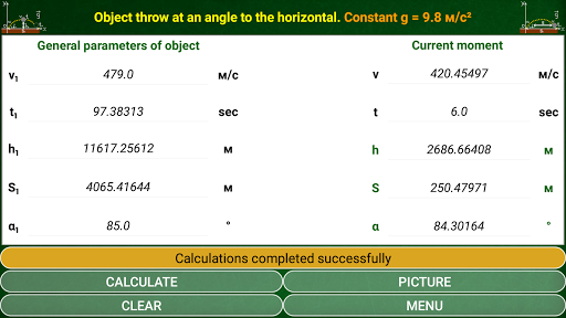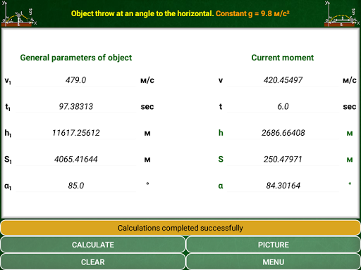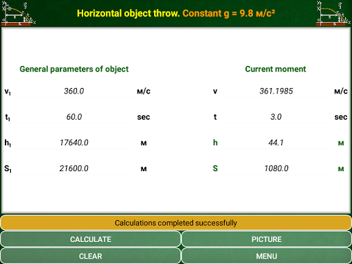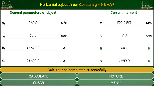 6) In laws: «Horizontal object throw» and «Object throw at an angle to the horizontal» some parameters are unavailable for input because they are calculated from other values.