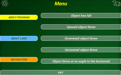 The current version contains 5 laws of physics and it is possible to calculate values and check the entered data: