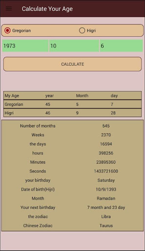 - Calculation of age in seconds, minutes, hours, days, weeks, months, years, and knowledge of the second date (Gregorian or Islamic)